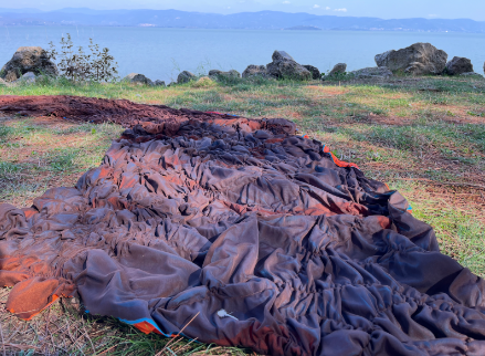 A materialidade do tecido é um fio condutor na obra de Ana Cristina Mendes, que desde sua história de vida ligada à moda e aos têxteis, traz essa característica nos seus trabalhos. Sobre os tecidos escolhidos para as obras de Cosmologia Tecida, ela os descreve como porosos, capazes de trazerem marcas que diminuem as distâncias. Eles também têm uma característica elástica, que alcança e retrai. “Eu vejo esses tecidos como abarcadores de mundos, já que ao levá-los para a natureza, eles ganham elementos dela”, explica Ana Cristina, reforçando que a areia, a vegetação e o sal são alguns dos elementos que se incorporam neles.