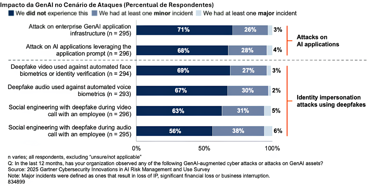 O levantamento revelou que, nos últimos 12 meses, 62% das organizações sofreram um ataque com deepfake envolvendo engenharia social ou exploração de processos automatizados, enquanto 32% disseram ter enfrentado um ataque a aplicações de Inteligência Artificial (IA) que explorou prompt da aplicação. Assistentes de chatbot são vulneráveis a uma variedade de técnicas de prompts adversariais, como atacantes que geram prompts para manipular Grandes Modelos de Linguagem (LLMs) ou modelos multimodais para produzir respostas enviesadas ou maliciosas.