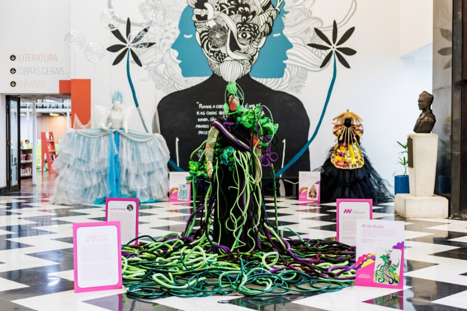 Ao todo, a exposição na Biblioteca Pública do Paraná conta com 10 figurinos expostos: Bruxa (João e Maria), Pé de Feijão, Fada Madrinha (Cinderela), Madrasta (Cinderela), Cinderela, Chapeuzinho Vermelho, Pequena Sereia, Príncipe Encantado, Espantalho (O Mágico de Oz), e Fada Primavera (A Bela Adormecida). Entre os destaques da mostra está o figurino da Pequena Sereia, confeccionado especialmente para a temporada portuguesa, que leva colheres de plástico e garrafas pet; e o Pé de Feijão, feito com mangueiras de jardim, espumas e tubos corrugados pintados, e peneiras de cozinha.