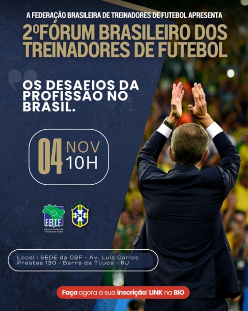 O Rio de Janeiro será palco do Segundo Fórum Brasileiro de Treinadores de Futebol. O evento, que reunirá grandes nomes do futebol, será no próximo dia 04 de novembro, na Sede da Confederação Brasileira de Futebol, a partir das 10 horas, com coffee break na recepção. O Fórum debaterá os desafio da profissão no Brasil e contará com a presenta do Presidente da CBF, Samir Xaud, e o treinador da Seleção, Carlo Ancelotti. Na ocasião, alguns treinadores serão homenageados por suas trajetórias dentro do futebol brasileiro e mundial. O Segundo Fórum Brasileiro de Treinadores de Futebol é realizado pela Federação Brasileiro dos Treinadores de Futebol (FBTF) em parceria com a Confederação Brasileira de Futebol. Notícia distribuída pela saladanoticia.com.br. A Plataforma e Veículo não são responsáveis pelo conteúdo publicado, estes são assumidos pelo Autor(a):